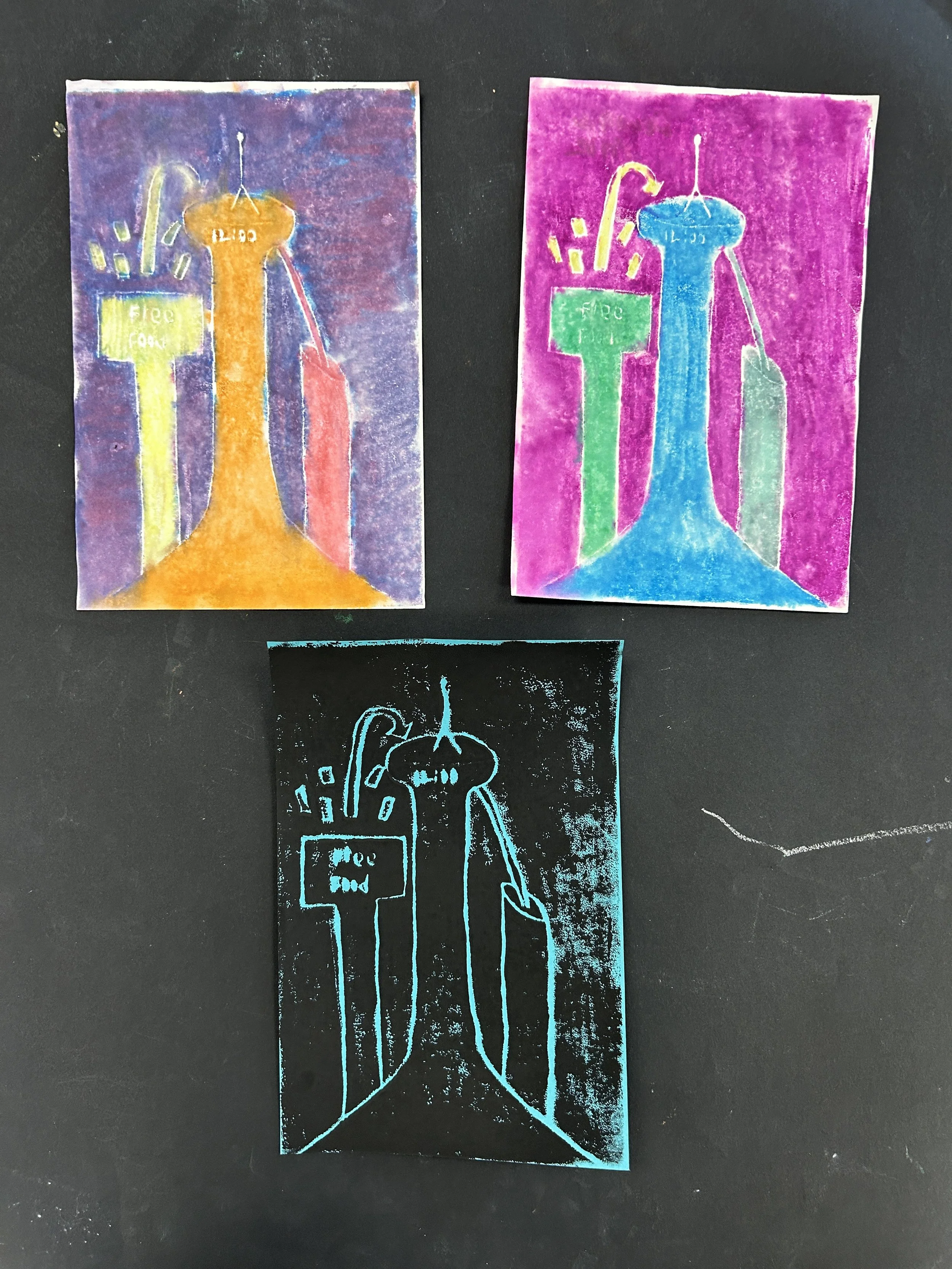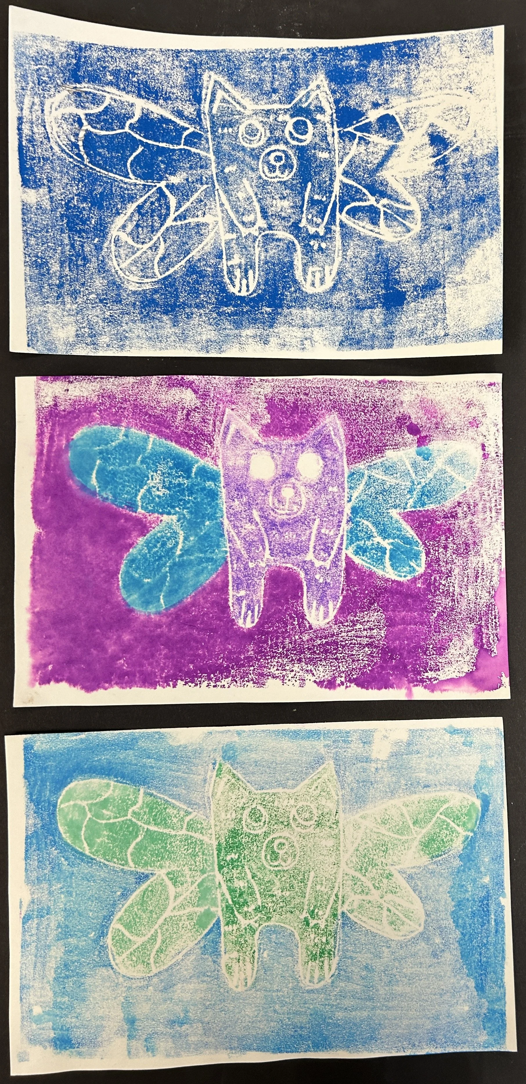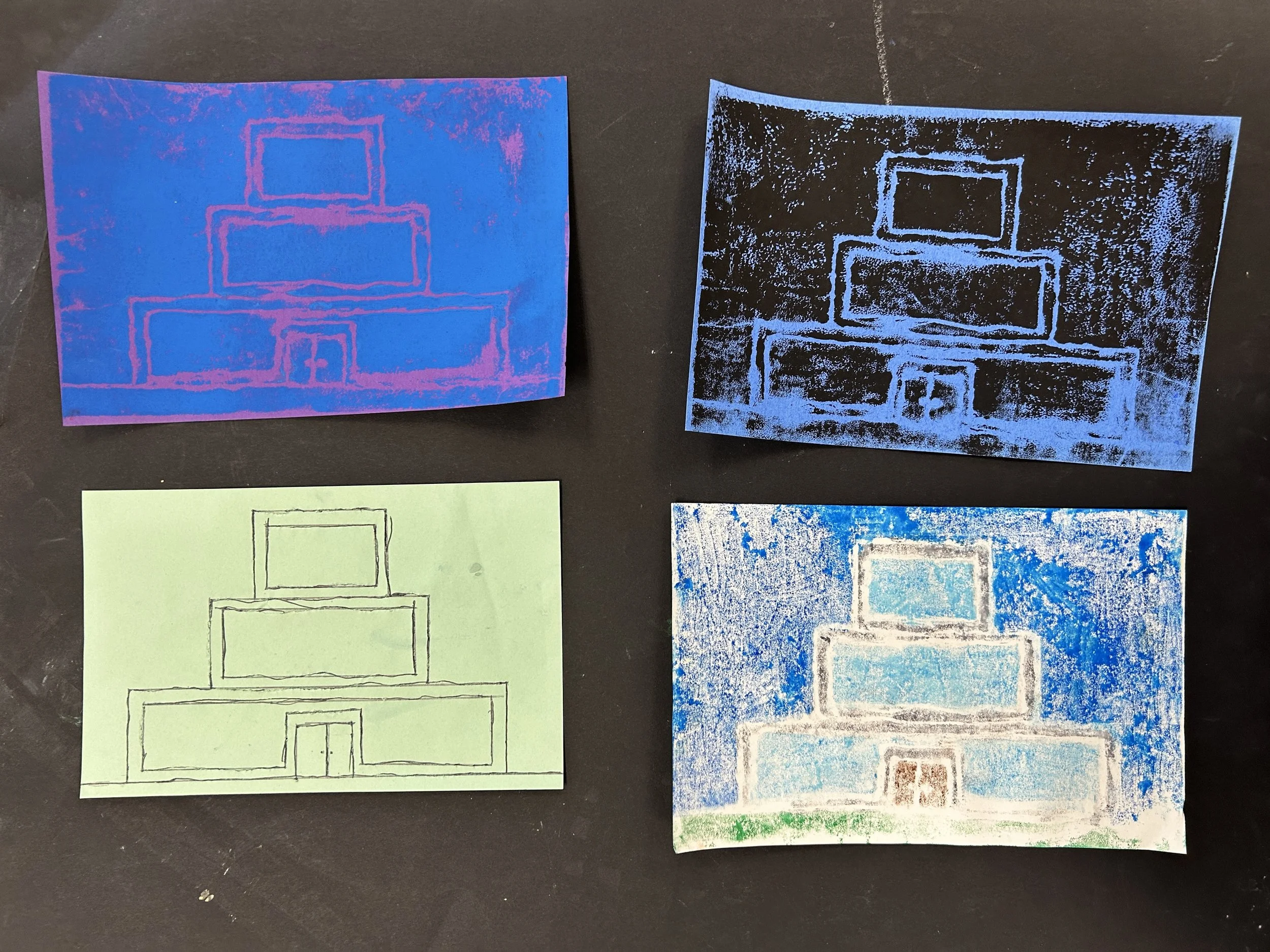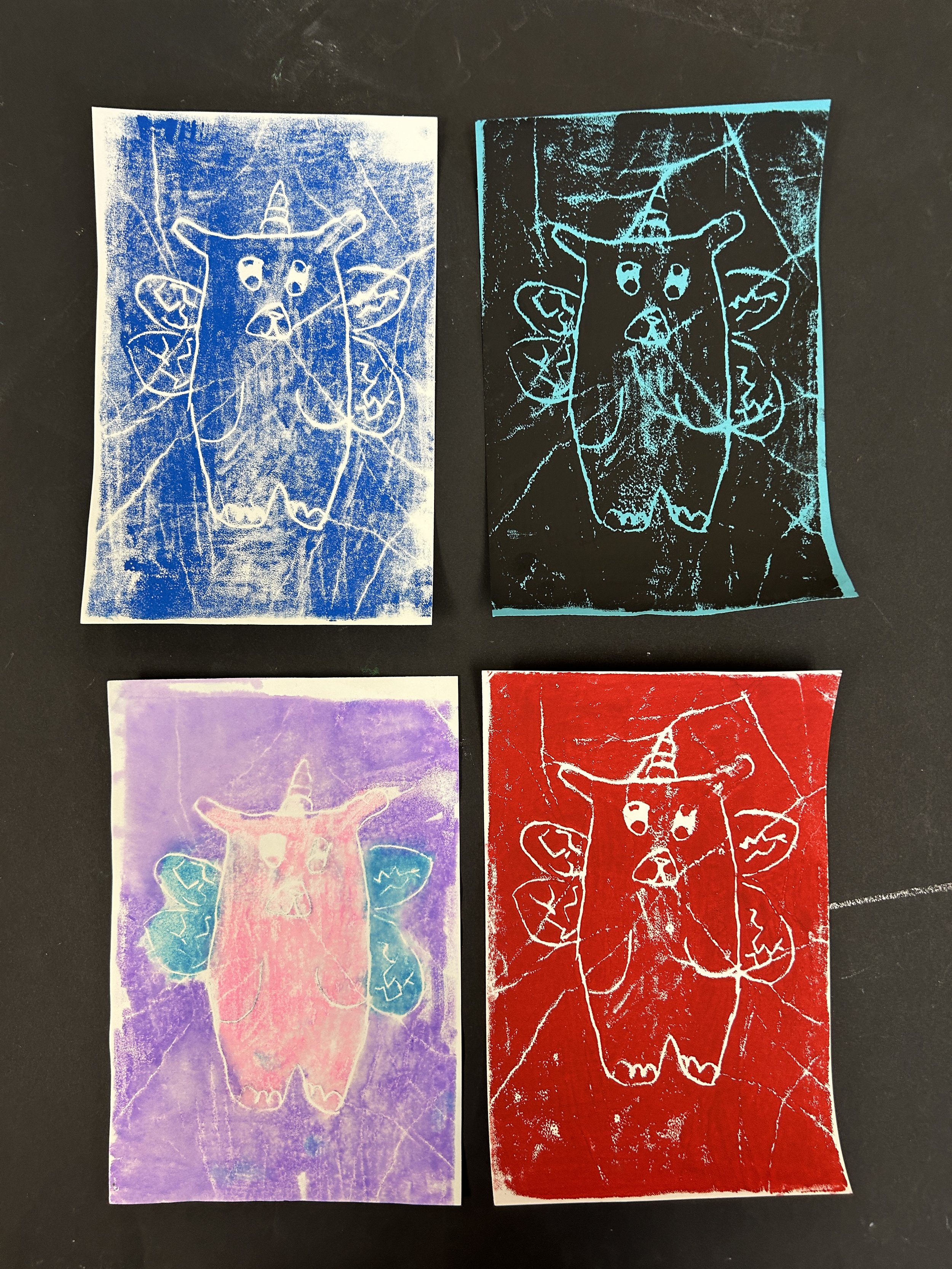 4th Grade printmaking unit using styrofoam, markers, and ink. One class created their own architecture design and another created their own mythical creature.